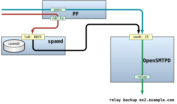 PFfor packet filtering and port redirection to spamdspamdrunning in default mode with greylisting enabledOpenSMTPDfor the actual SMTP service (working as MTA only)OpenBGPDfor instant black-list and white-list updates from the OpenBGPD project’s route-servers